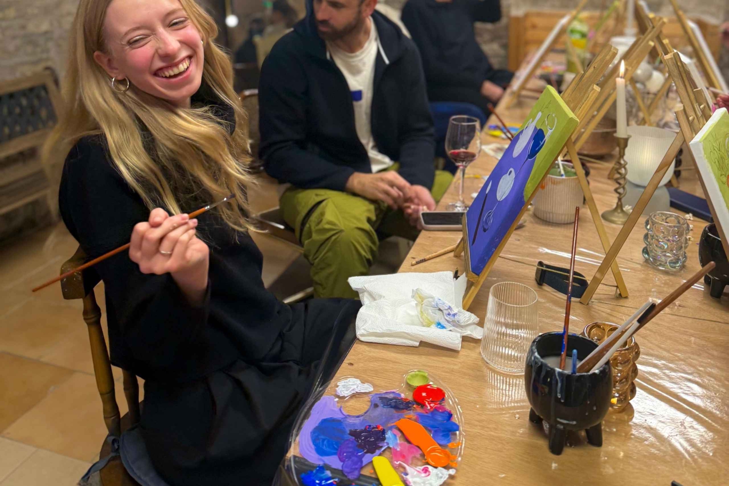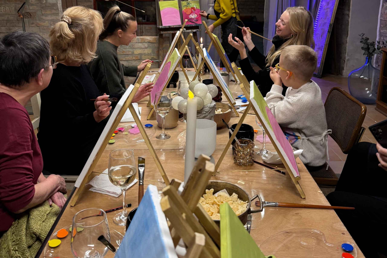 Släpp loss din kreativitet med en rolig och avkopplande målar- och vinupplevelse i Budapest! Delta i en guidad session där en lokal konstnär leder dig steg för steg för att skapa ditt eget konstverk, allt medan du smuttar på ungerska viner. Allt material, lite snacks och vin ingår, så att du kan släppa loss, fokusera på din målning och njuta av stunden till fullo. Oavsett om du är nybörjare eller erfaren målare är detta det perfekta sättet att koppla av, umgås och ta med dig en unik souvenir hem från din resa.Includes